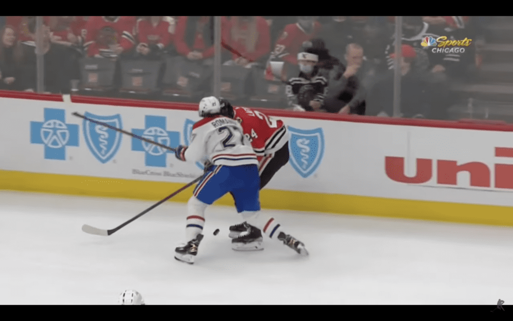 While the Montreal Canadiens were absolutely dumbfounded that their goalie Sam Montembeault was bulldozed in the crease on Kurashev’s overtime winner and still have the goal count, and then still not have an offside call disallow the goal, they seemed equally frustrated that defenseman Alexander Romanov laid an absolutely clean hit on Blackhawks forward Sam Lafferty in the second period and had to drop the gloves with Blackhawks forward Ryan Carpenter for the hit.