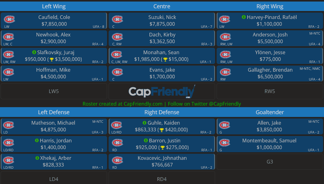 As has been the case throughout the summer, in our projection we’re assigning Michael Pezzetta, Rem Pitlick, and Chris Wideman to the Laval Rocket, where their contracts will be below the league threshold, and will therefore no longer count on the salary cap.