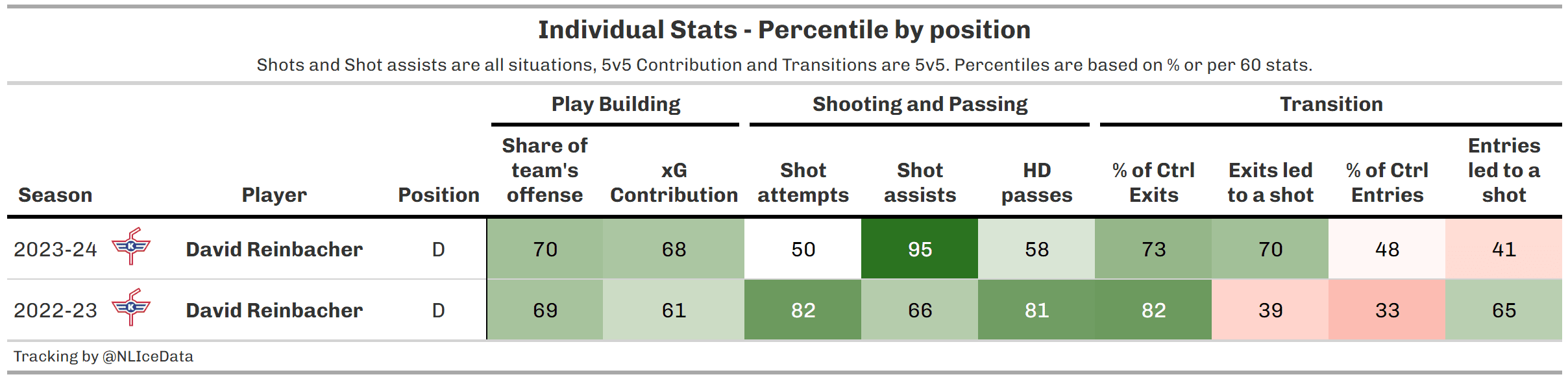 The good news according to hockey analyst Thibaud Chatel is that Reinbacher’s underlying numbers are still very good, but you’ll note that some of the metrics tied to mobility (controlled exits, controlled entries) are still concerning.