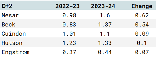 Ideally, you want to see significant growth when it comes to Draft+1 seasons. In this case, we’re dealing with two defencemen playing professional hockey and one forward who is older than most of his draft counterparts.