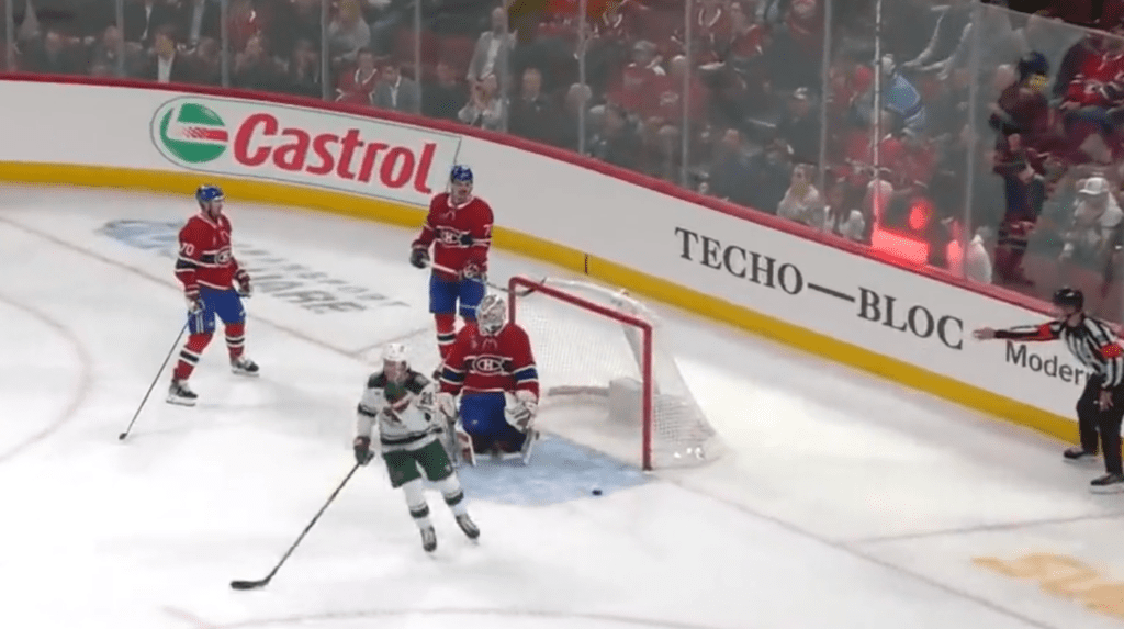 The Wild came incredibly close to scoring their fourth goal of the game just a few moments later. Montembeault, who struggled throughout the game, had a hard time tracking a pass, which led to a loose puck in his crease.