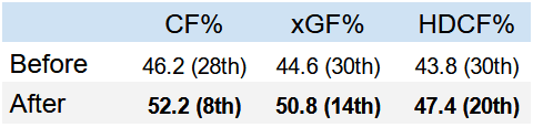 Prior to the trade with the Nashville Predators, the Habs ranked 28th in shot share (CF%), 30th in expected goals (xGF%), and 30th in high-danger chances (HDCF%).