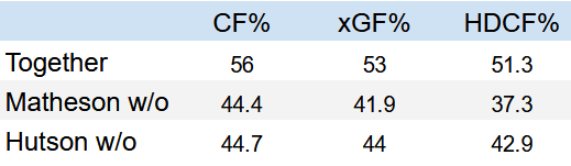 Since the Carrier trade, Hutson and Matheson have managed to control 58 percent of the shots (CF%), 55.3 percent of the expected goals (xGF%), and 54.5 percent of the high-danger scoring chances (HDCF%).
